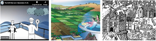 L’image du pilote au sommet : A) Tenant dans sa main le baromètre du vivant (IUCN), B) planifiant l’occupation de l’espace (issu de MEA(22)), ou C) Dans une gravure de Francis Bacon réalisée en 1627, au sommet de la connaissance, dominant ce qui se passe sur terre et dans le ciel.