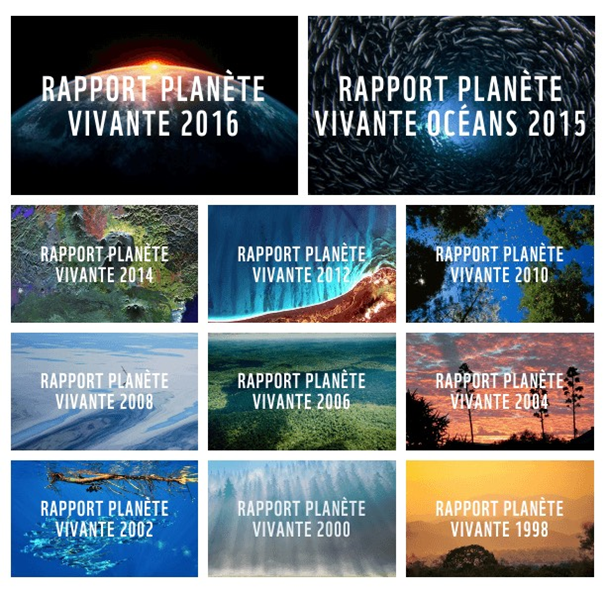 Succession des rapports « planète vivante » accumulés par le WWF depuis 1998 (https://www.wwf.fr/champs-daction/rapport-planete-vivante).
