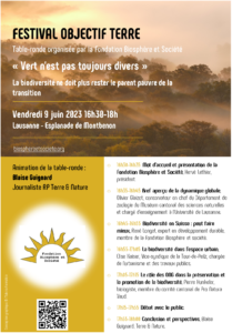 La Fondation Biodiversité et Société a organisé le 9 juin dernier une table-ronde sur la conservation du Vivant, dans le cadre du Festival Objectif Terre qui se tiendra à l’Esplanade de Montbenon, Lausanne.